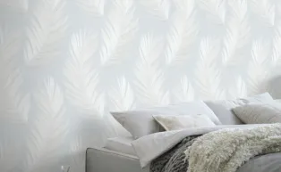 • Helles Schlafzimmer, Blättertapete in Weiß